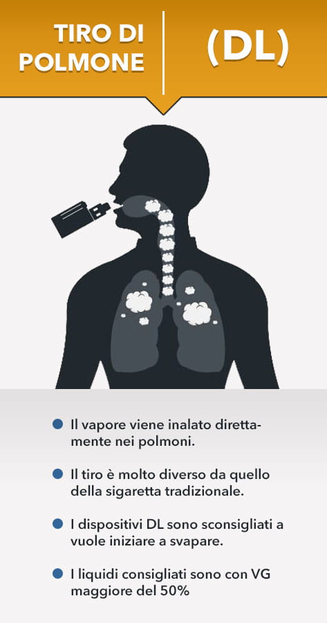 DL invece, un altro acronimo anglosassone, Direct Lung (direttamente nel polmone) indica il tiro polmonare, arioso, e consiste nel respirare direttamente saltando quindi il passaggio dell'aspirazione "stile sigaretta" con la guancia. Questa tipologia di svapo "avanzata" è molto diffusa tra i giovani, amanti dei grandi nuvoloni e dei dispositivi potenti e aggressivi.