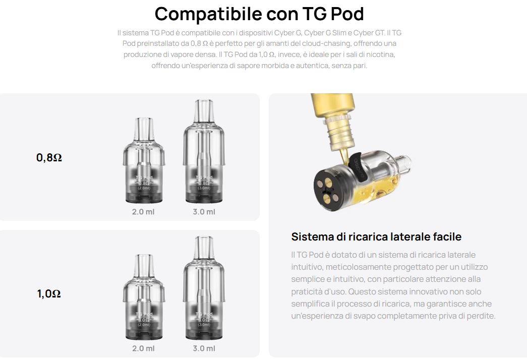 La cartuccia TG Pod, compatibile con i modelli precedenti della serie Cyber G, ha una capacità di 3ml e si riempie comodamente attraverso uno sportellino laterale. Include una resistenza integrata a mesh in Kanthal da 0.8ohm (non removibile), ideale per un tiro di guancia arioso. È possibile acquistare separatamente una versione da 1.0ohm per un tiro più contrastato.