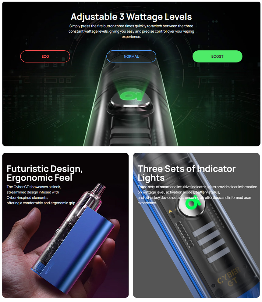 L'Aspire Cyber GT è una sigaretta elettronica pod mod con tiro di guancia e ingresso dell'aria fisso, dotata di 3 regolazioni di potenza selezionabili (Eco, Normal e Boost) per personalizzare l'esperienza di svapo.