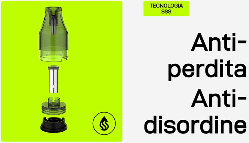 La pod magnetica in dotazione ha un serbatoio da 5ml ricaricabile dal basso tramite vano con tappo in silicone. La coil integrata da 0.6ohm si avvale della tecnologia COREX che assicura un riscaldamento più rapido e uniforme e ne prolunga la durata della pod. L’airflow è modulabile ruotando la pod per poter chiudere o aprire le asole in base alle proprie esigenze di svapo.